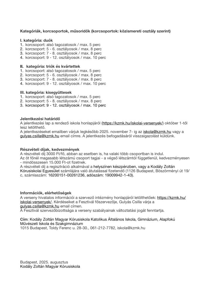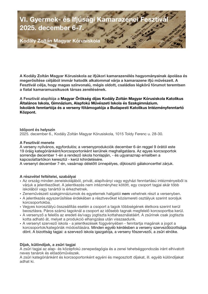 2025. december elején immár hatodik alkalommal rendezi meg iskolánk, a Kodály Zoltán Magyar Kórusiskola ezt az általatok már 2009 óta jól ismert zenei versenyt, a Kamarazenei Fesztivált. A versenyre kizárólag alapfokú hangszeres és énekes kamarazenei produkciókat várunk. Az alábbiakban olvashatjátok a versenykiírást, benne – remélhetőleg – minden fontos információval.