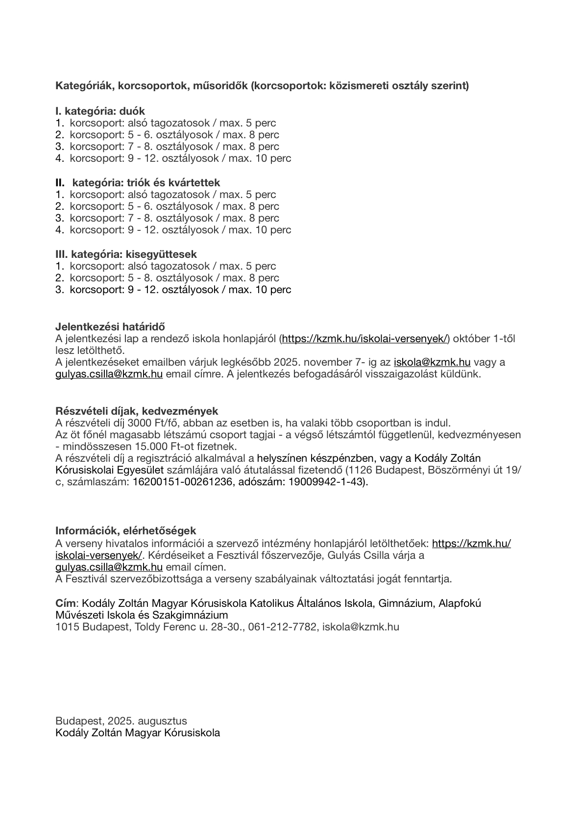 2025. december elején immár hatodik alkalommal rendezi meg iskolánk, a Kodály Zoltán Magyar Kórusiskola ezt az általatok már 2009 óta jól ismert zenei versenyt, a Kamarazenei Fesztivált. A versenyre kizárólag alapfokú hangszeres és énekes kamarazenei produkciókat várunk. Az alábbiakban olvashatjátok a versenykiírást, benne – remélhetőleg – minden fontos információval.
